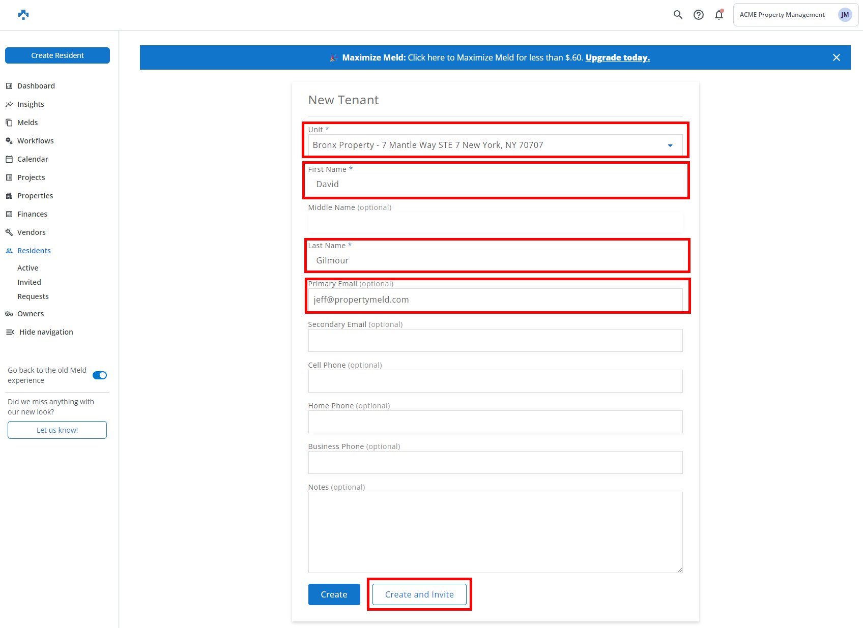 Enter the required fields (outlined in the screenshot below). Click CREATE & INVITE.