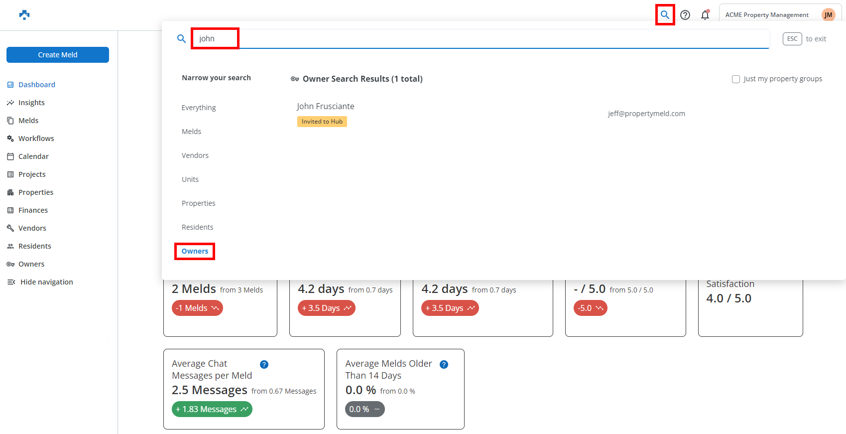 The search icon in the upper right corner of Property Meld provides a shortcut to Everything, Melds, Vendors, Units, Properties, Residents, and Owners.
