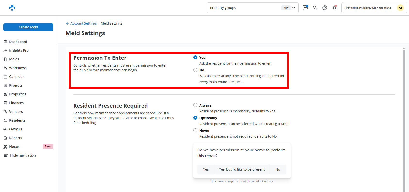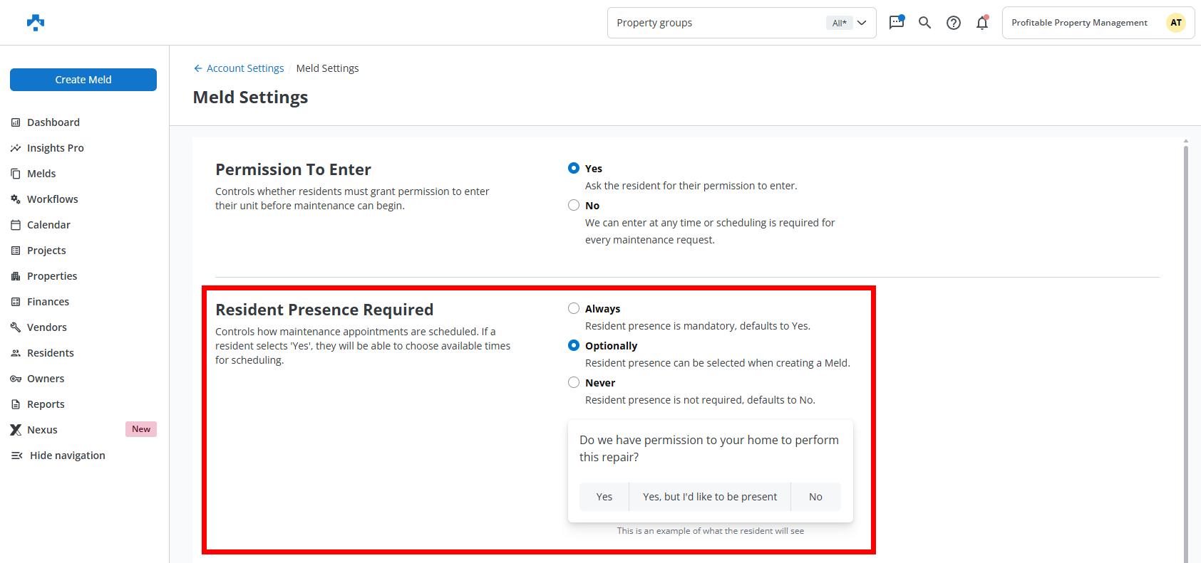 In Account Settings, you can choose whether Resident Presence Required is Always applied, Optionally selected, or Never applied. This setting will affect all future Melds.