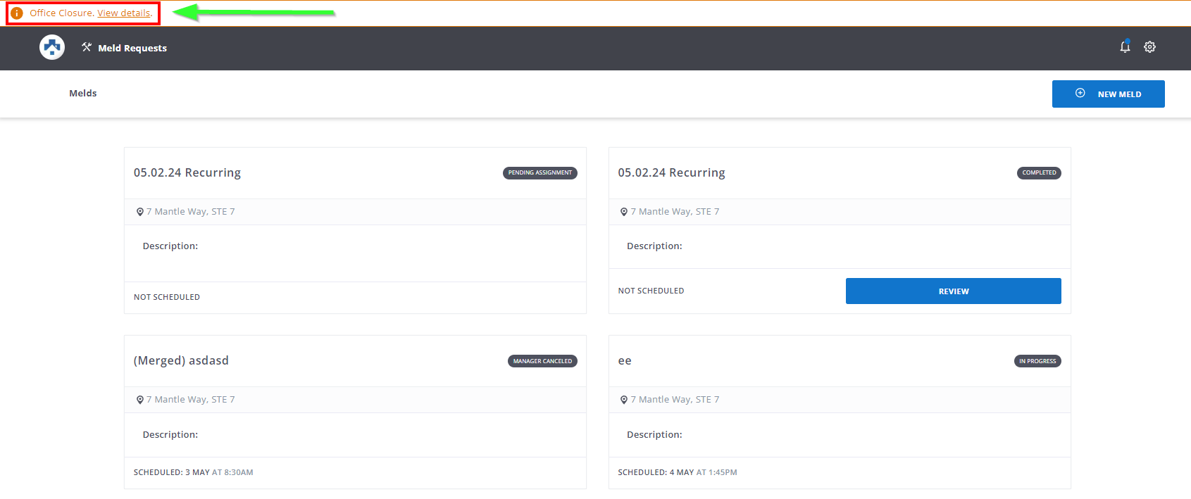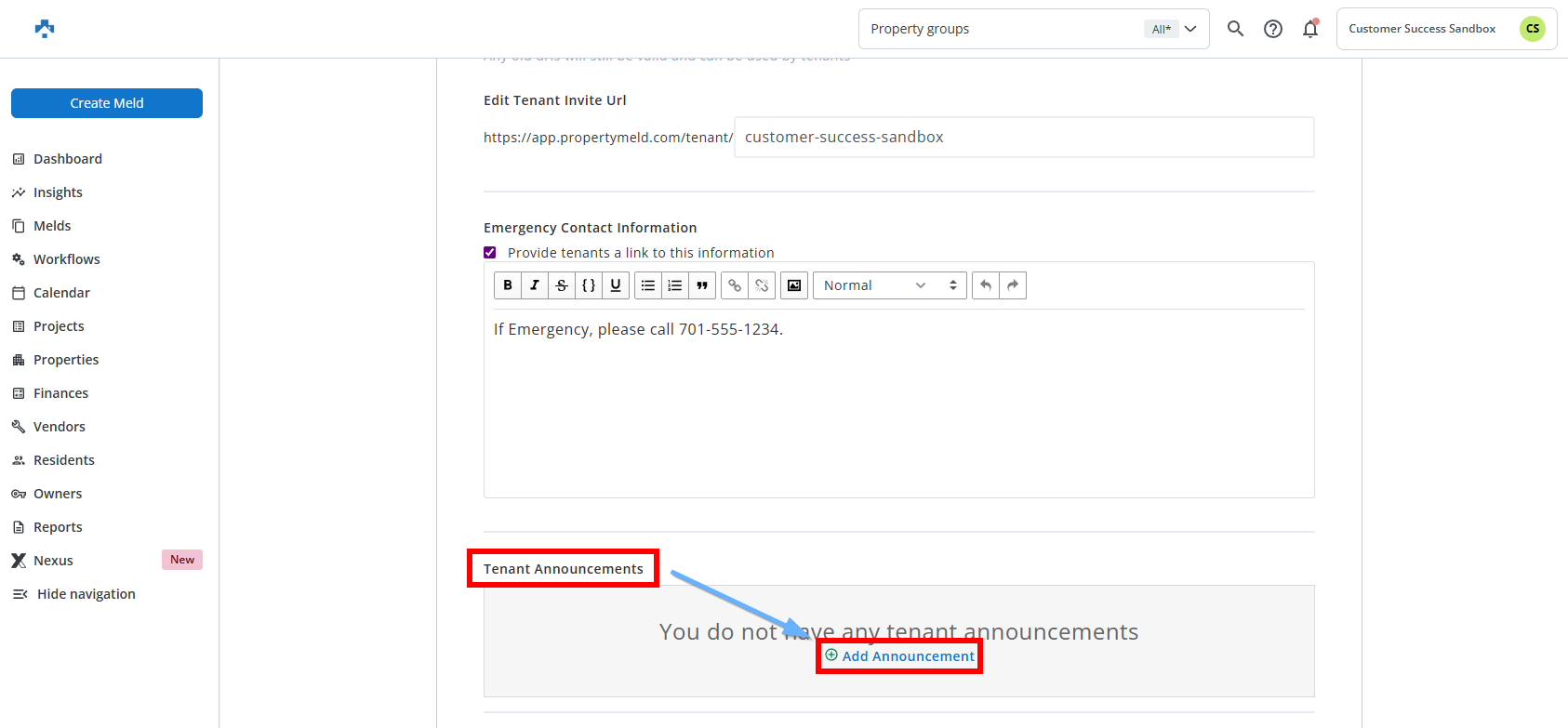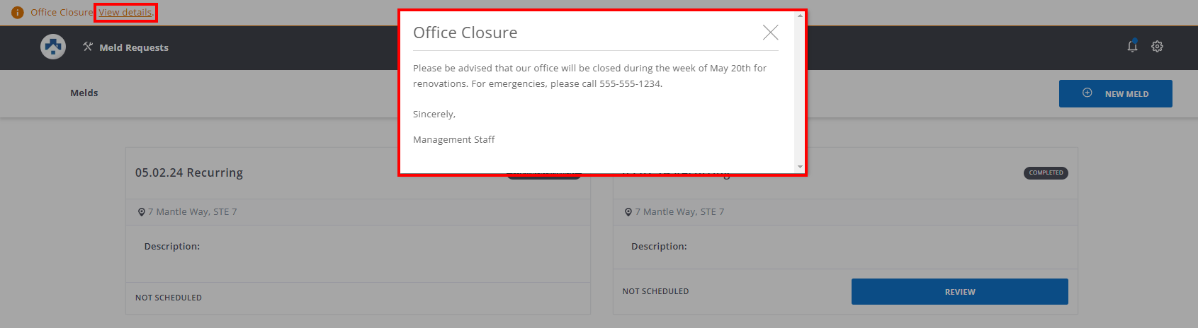 Property Managers are able to create and edit an announcement that appears as a banner across the top of the page when displayed to Residents.