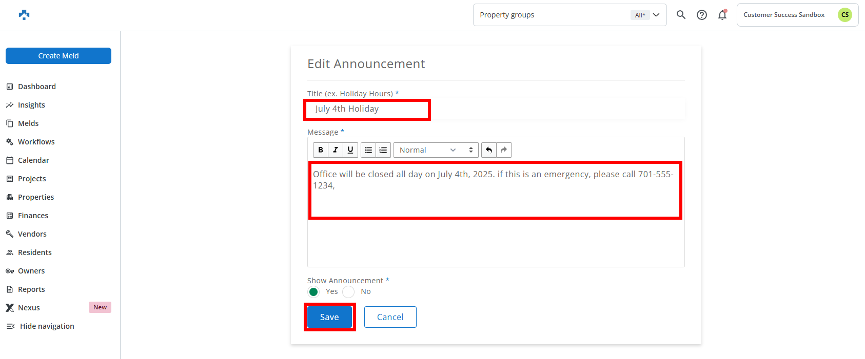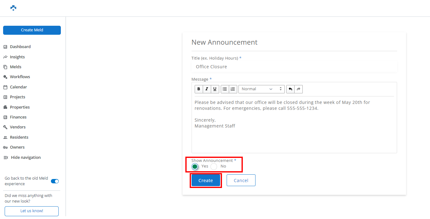 You must select 'Yes' beneath 'Show Announcement*' for your Announcement to be displayed to Residents.