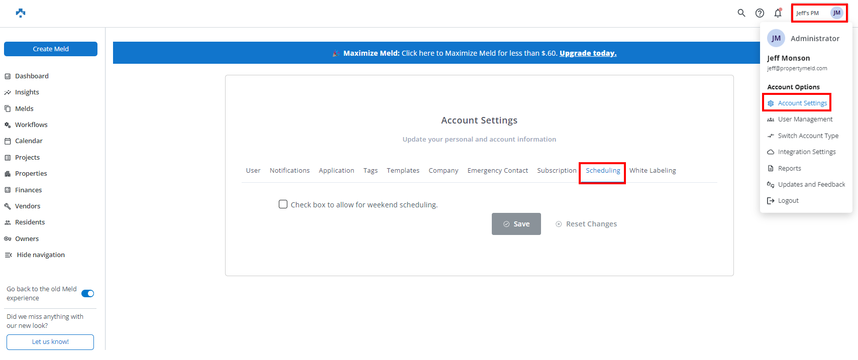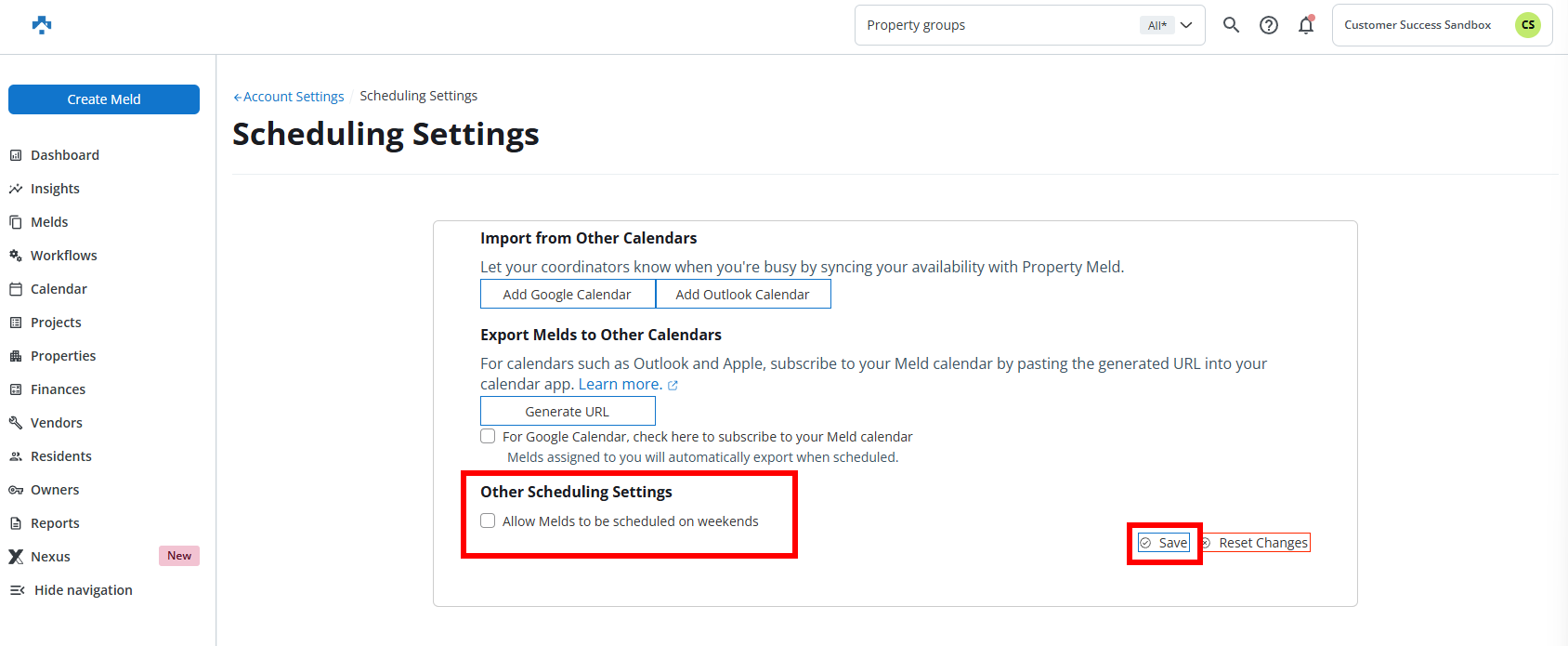 Check or uncheck box under Other Scheduling Settings to allow or not allow Melds to Melds to be scheduled on the weekend. The click Save.