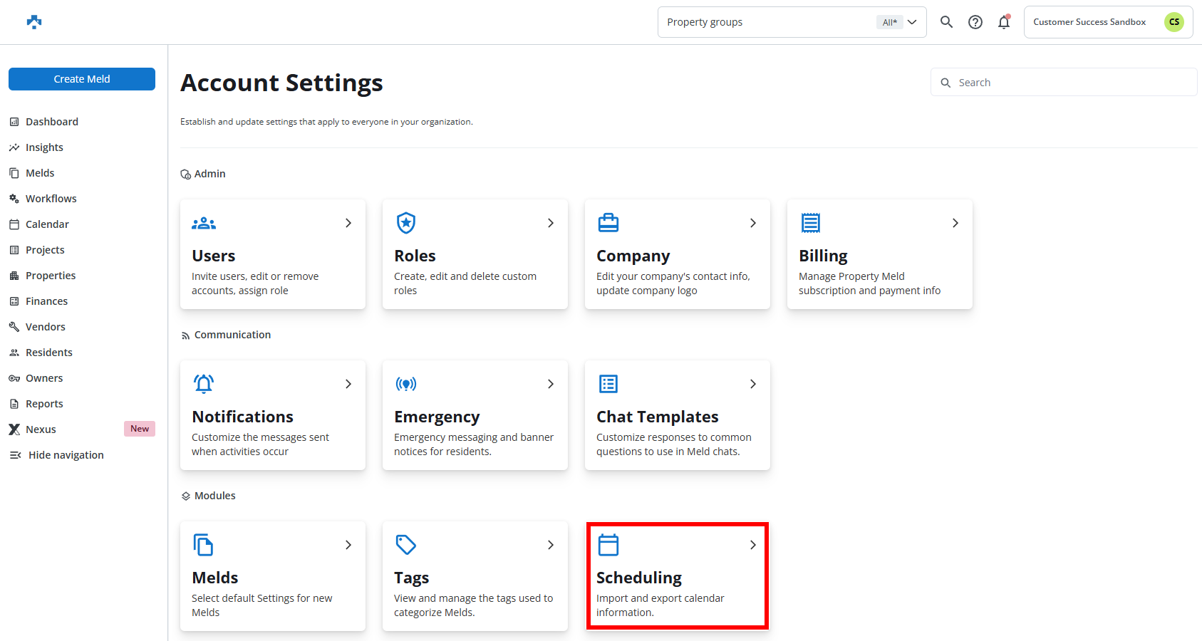 Click company name, select Account Settings from the dropdown menu, then click on the Scheduling tab.