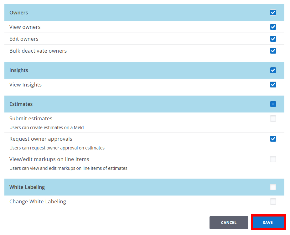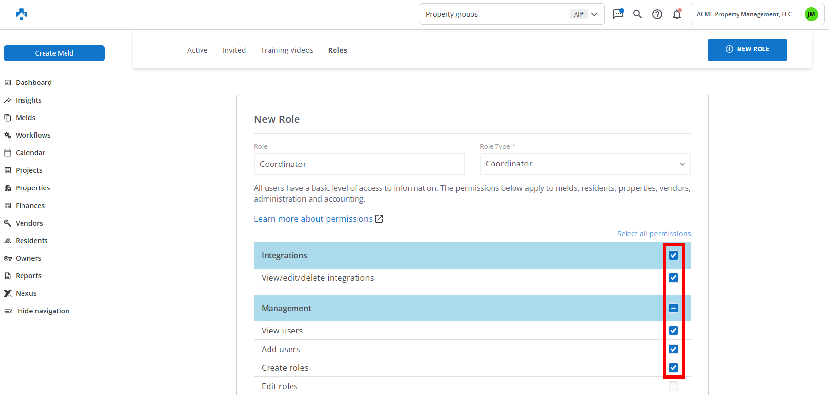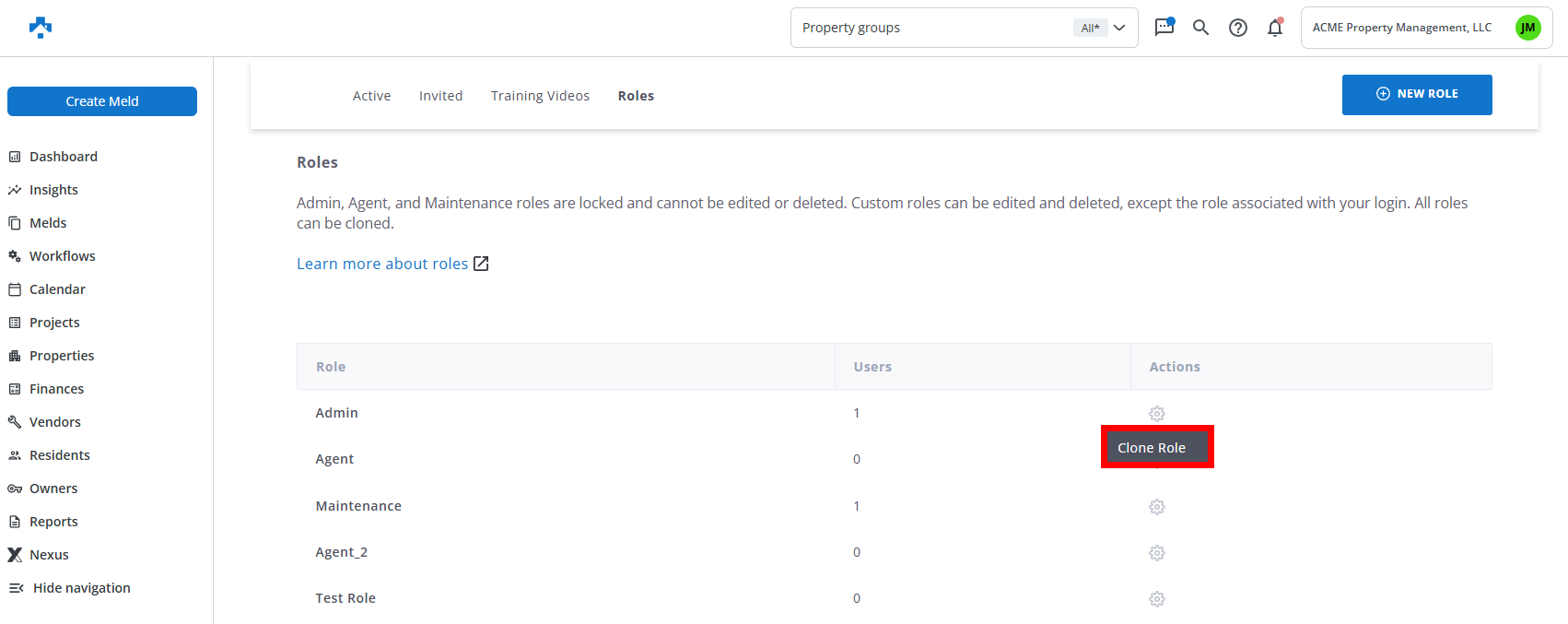 Property Meld allows you to create Roles with a specific set of permissions if you are operating under the Admin Role. You can create a truly Custom Role or you can clone an existing Role and edit the permissions.