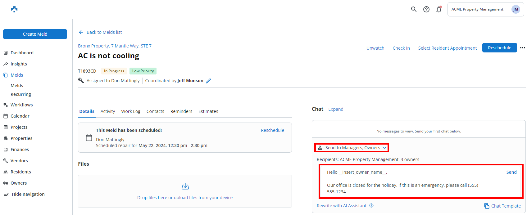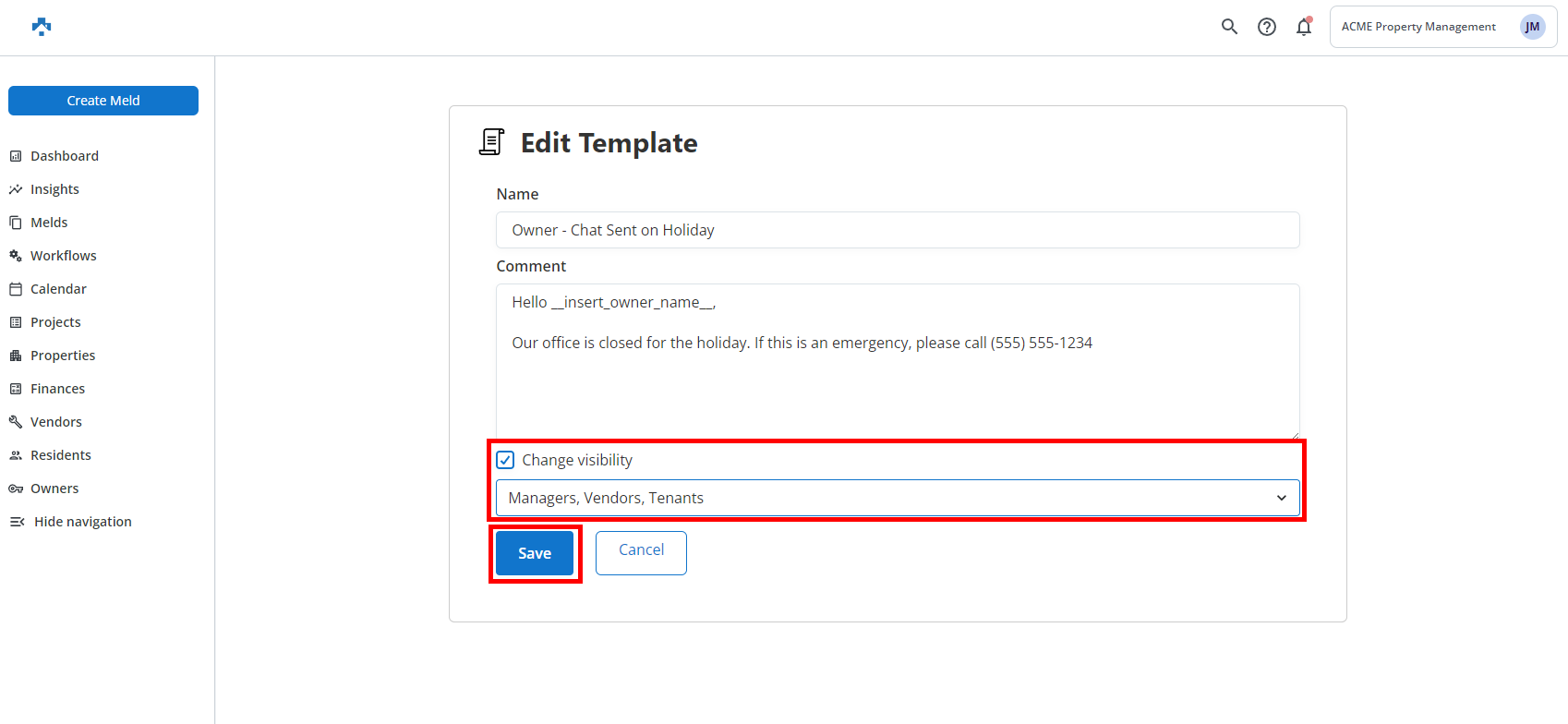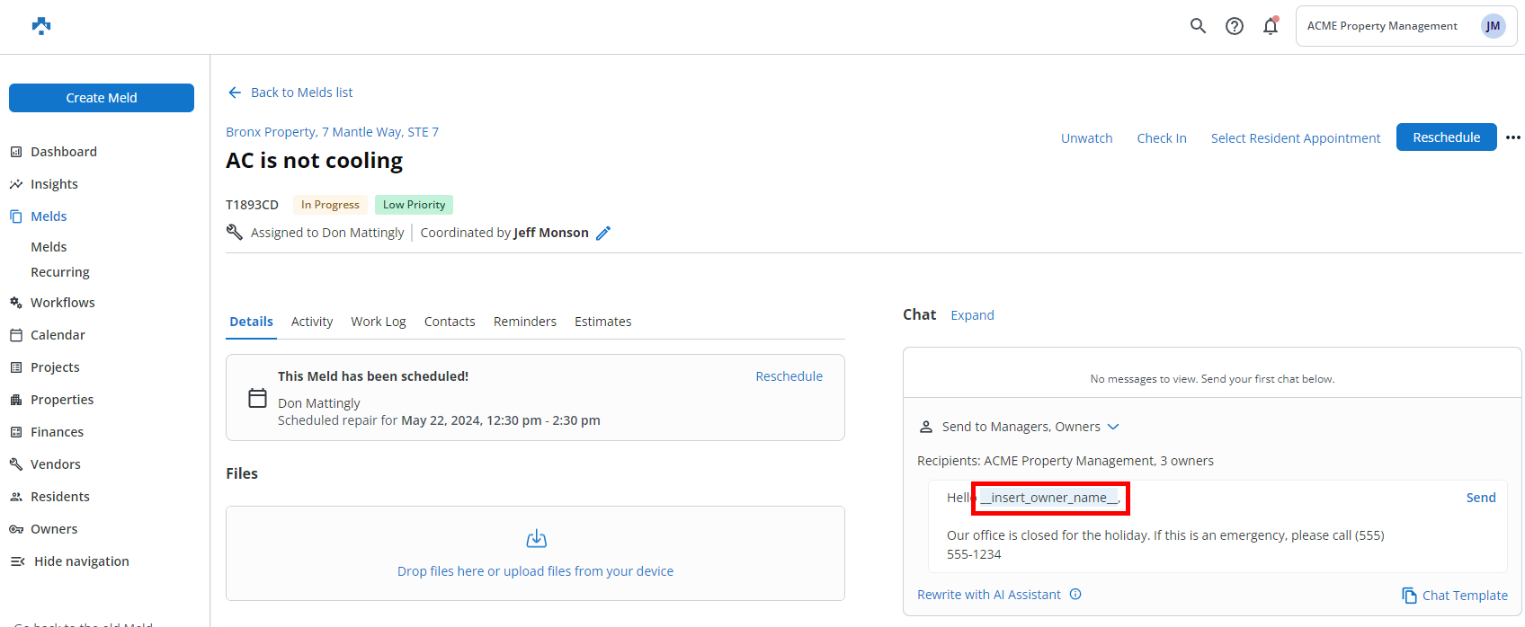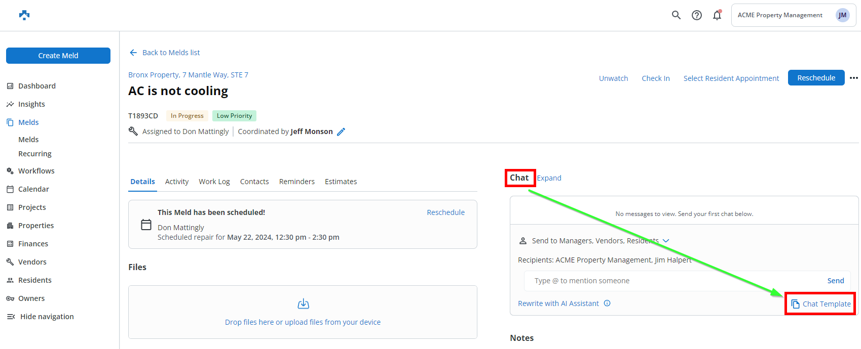 Chat Templates can be an extremely effective and efficient way to use in messaging with various parties in Meld Chat. Chat Templates also build consistency in messaging with all of your Residents, Owner, and Vendors. This article will provide steps in configuring and organizing Chat Templates as well as how to use the templates including a few valuable suggestions.