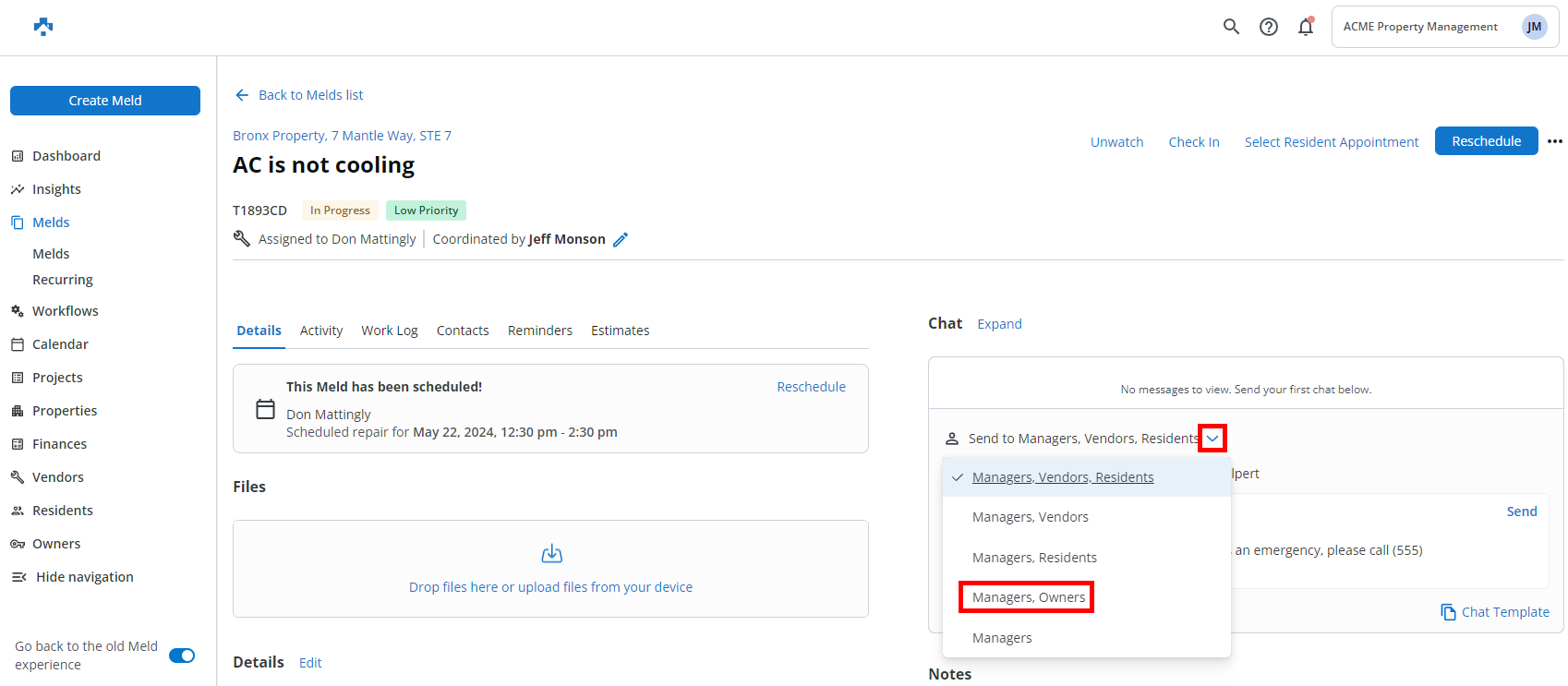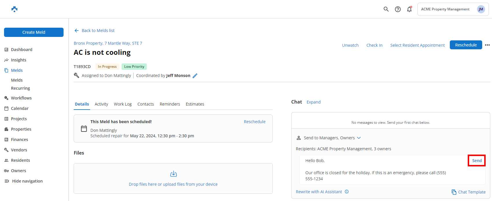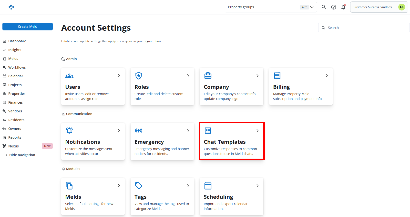 Chat Templates can be an extremely effective and efficient way to use in messaging with various parties in Meld Chat. Chat Templates also build consistency in messaging with all of your Residents, Owner, and Vendors. This article will provide steps in configuring and organizing Chat Templates as well as how to use the templates including a few valuable suggestions.
