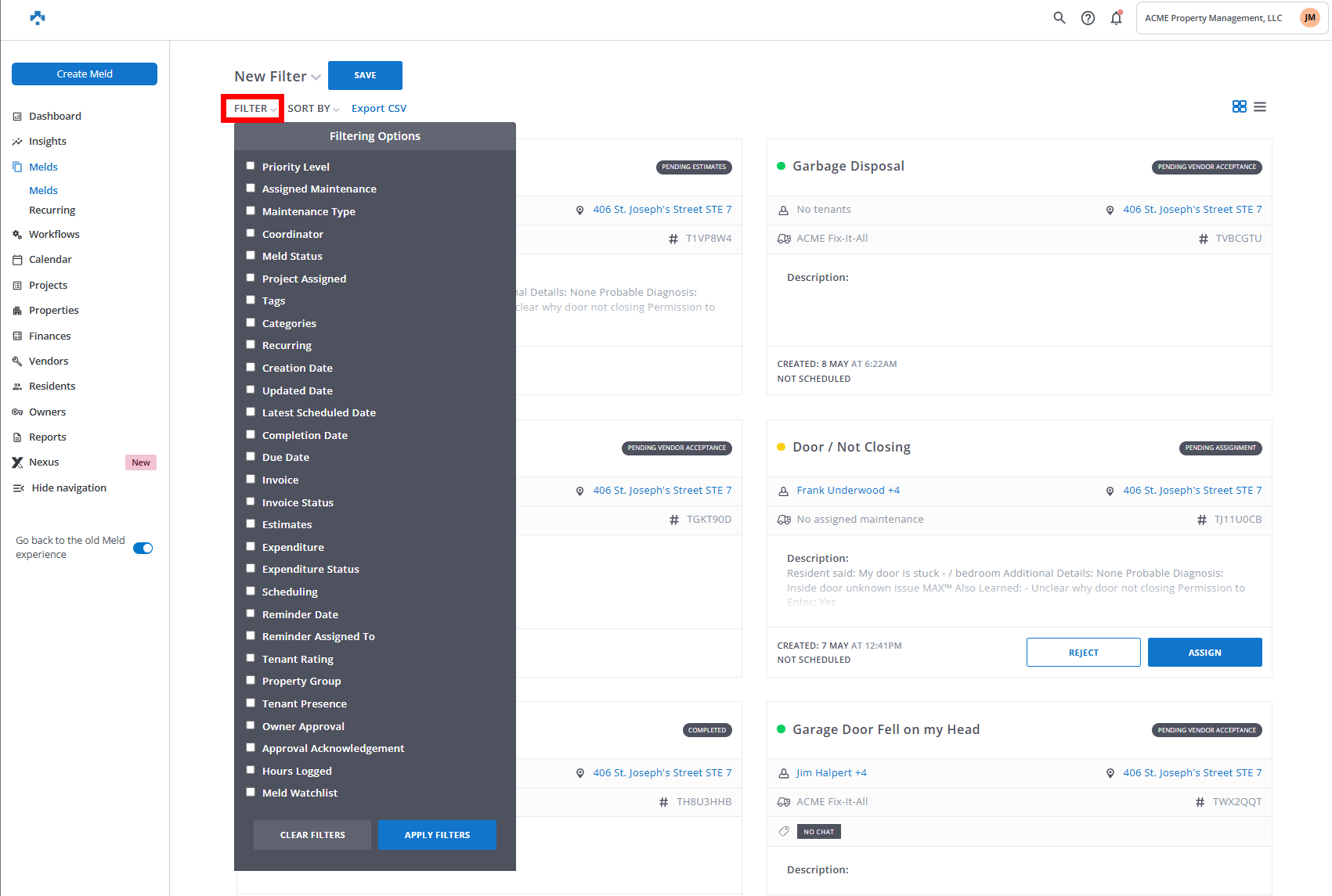 - Filters Melds according to an Owner Approval being Acknowledged, or Not Acknowledged, by a Property Manager.