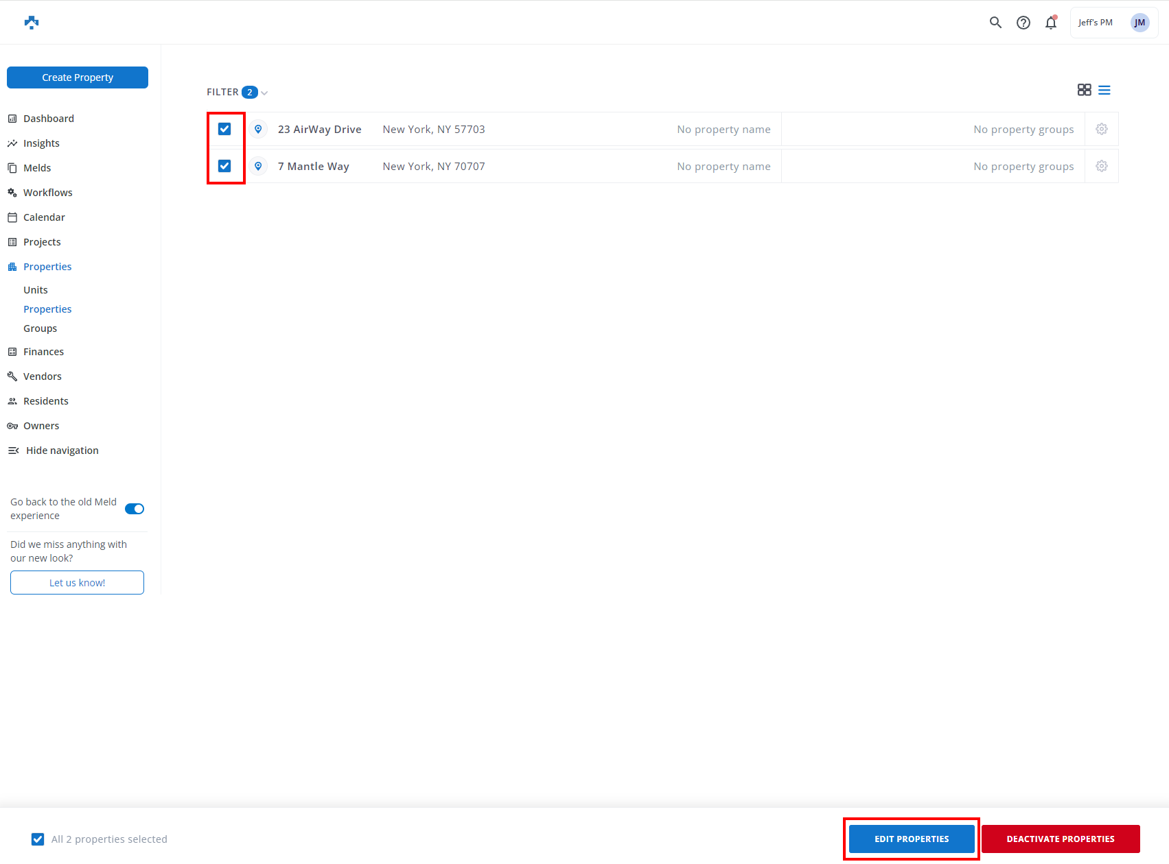 Check 2 properties displayed in the filtered list, then click EDIT PROPERTIES.