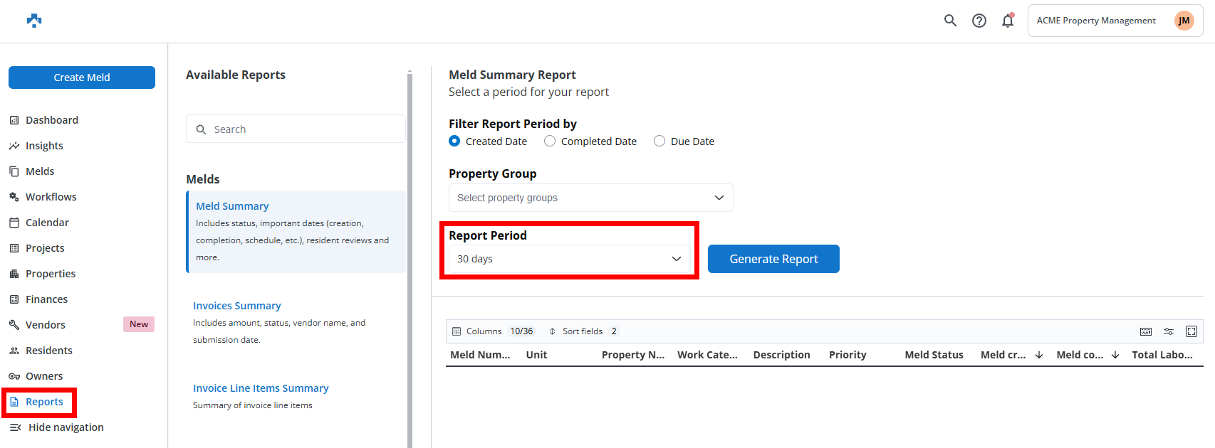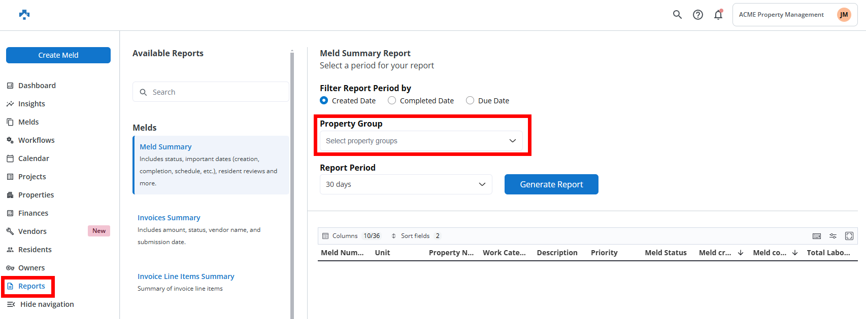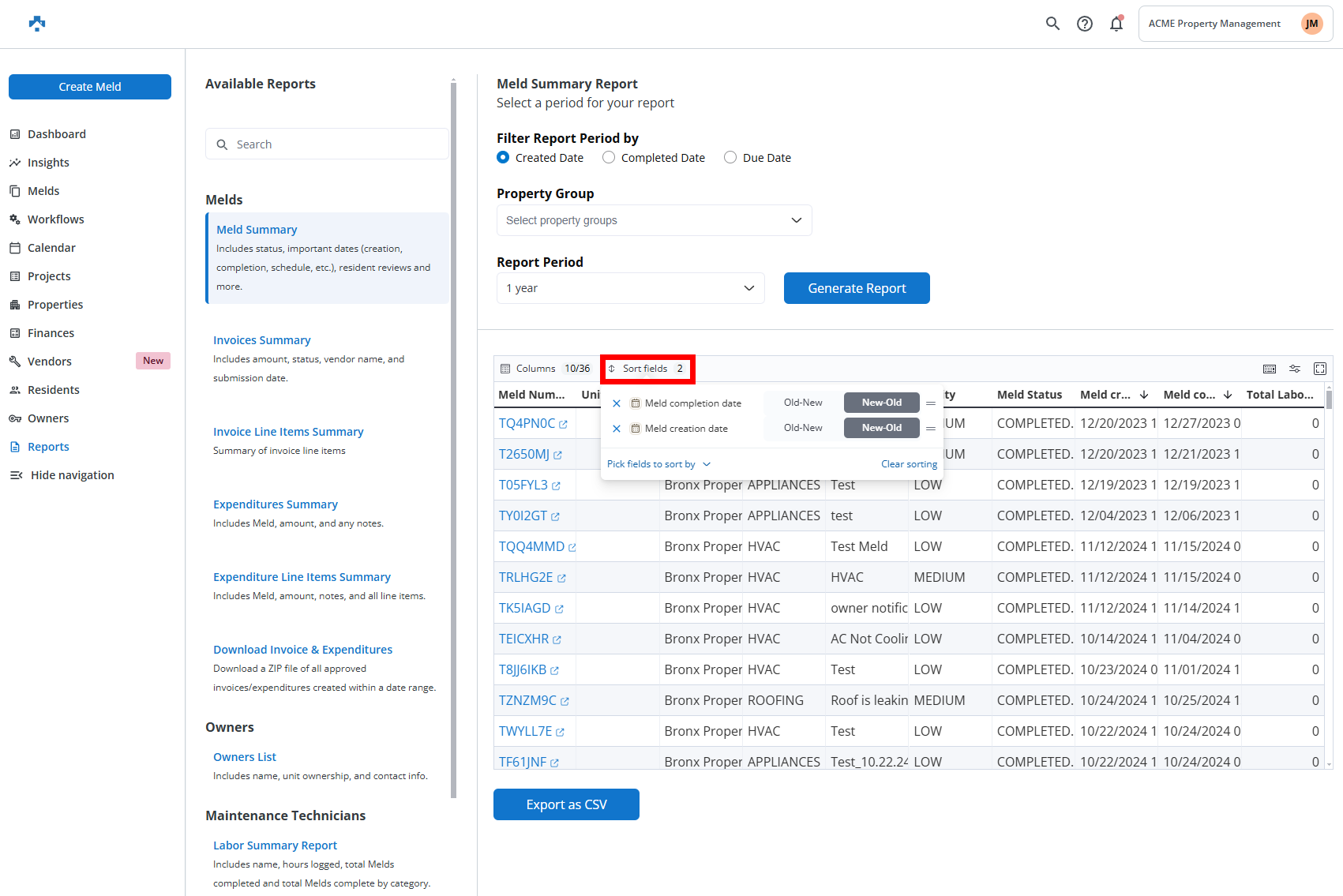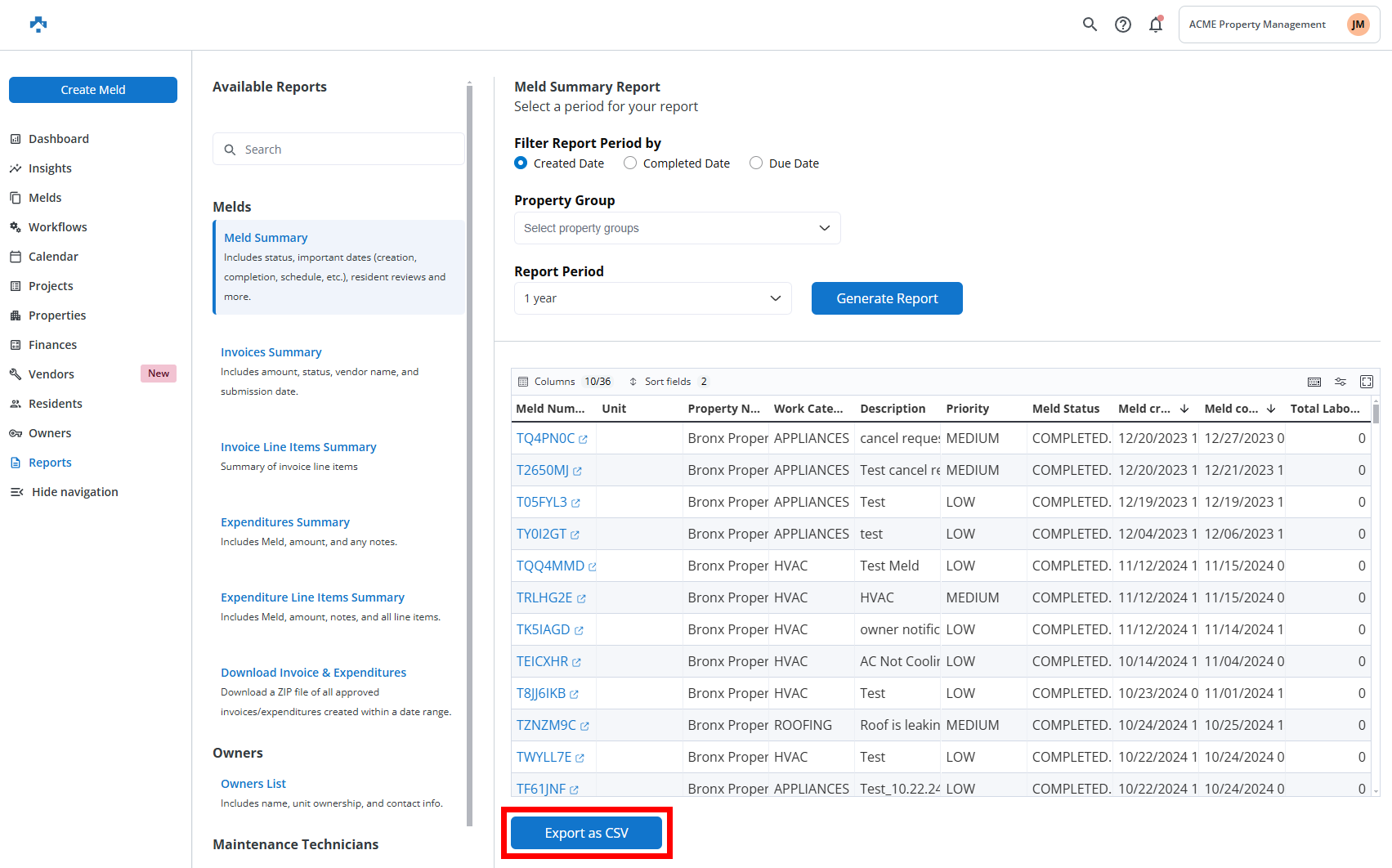 The Reports section in Property Meld allows you to access a variety of summaries and detailed insights related to maintenance, invoices, technicians, residents, and more. Here’s a breakdown of the reports you can generate: