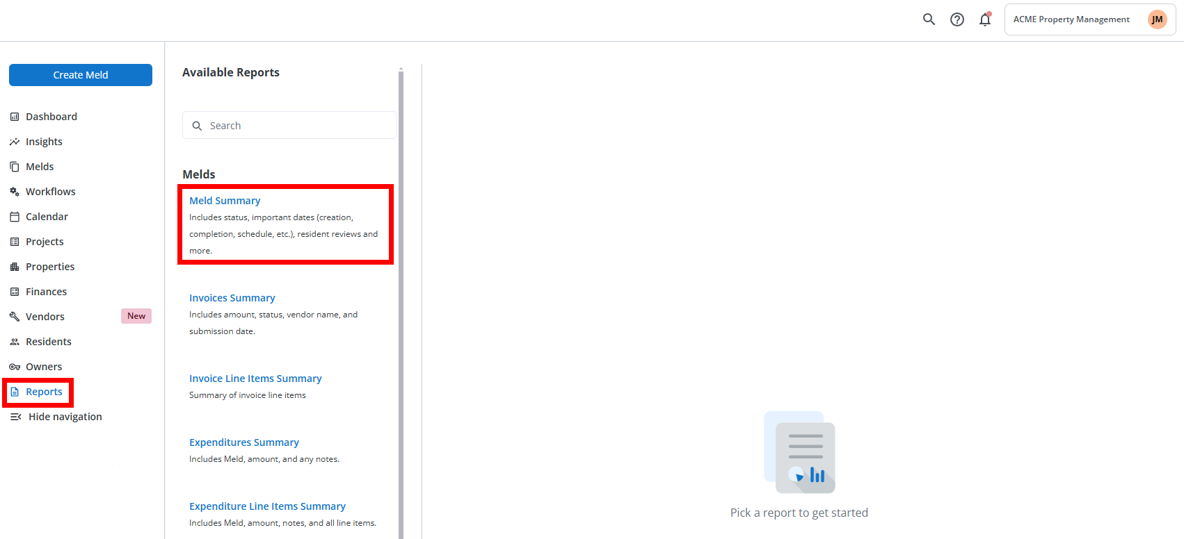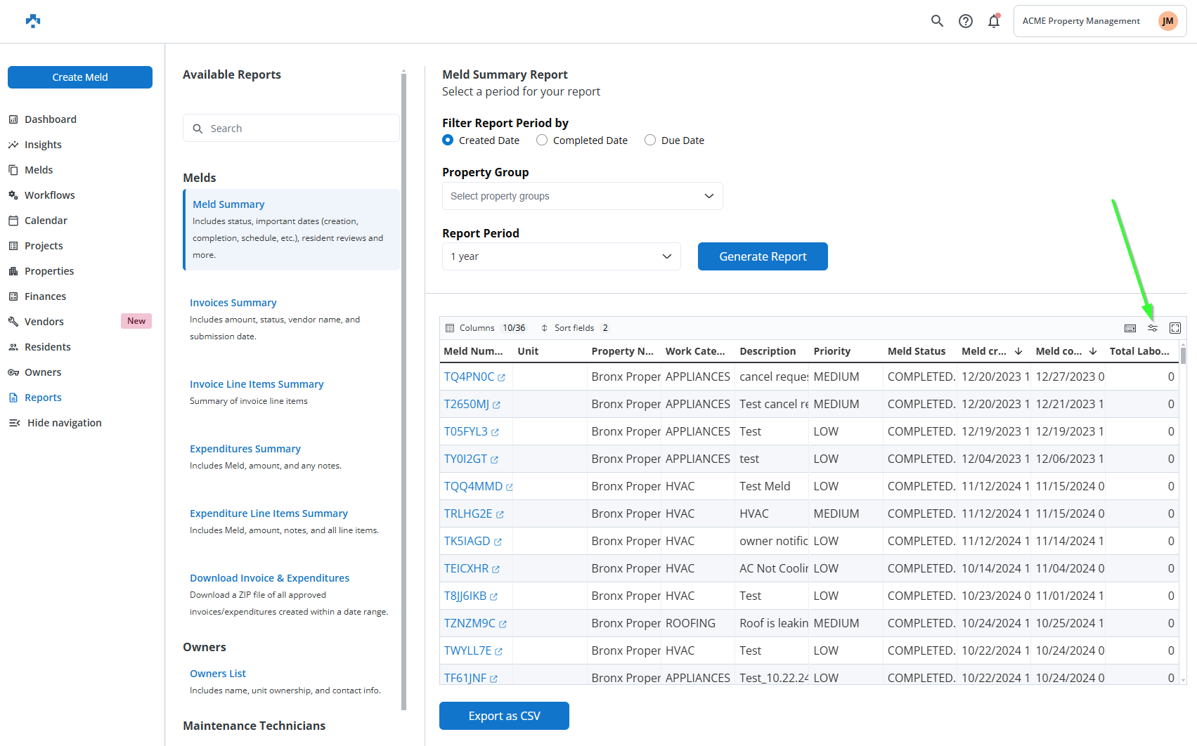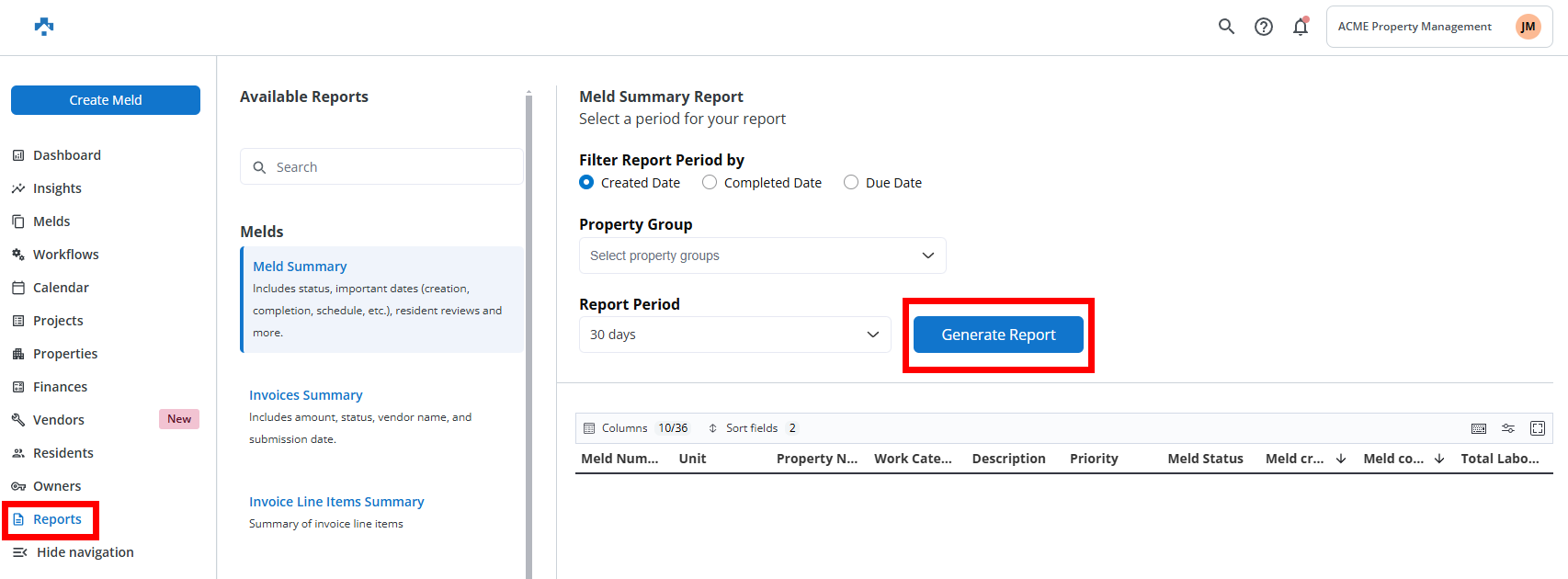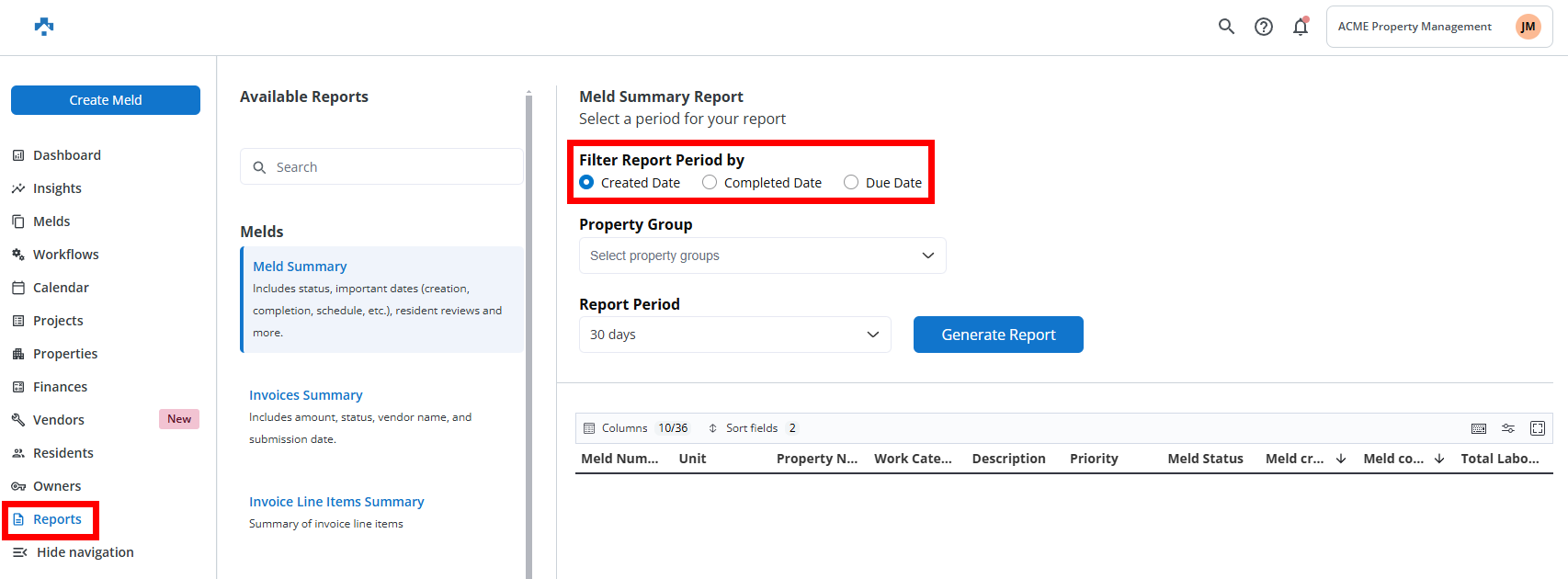 The Reports section in Property Meld allows you to access a variety of summaries and detailed insights related to maintenance, invoices, technicians, residents, and more. Here’s a breakdown of the reports you can generate: