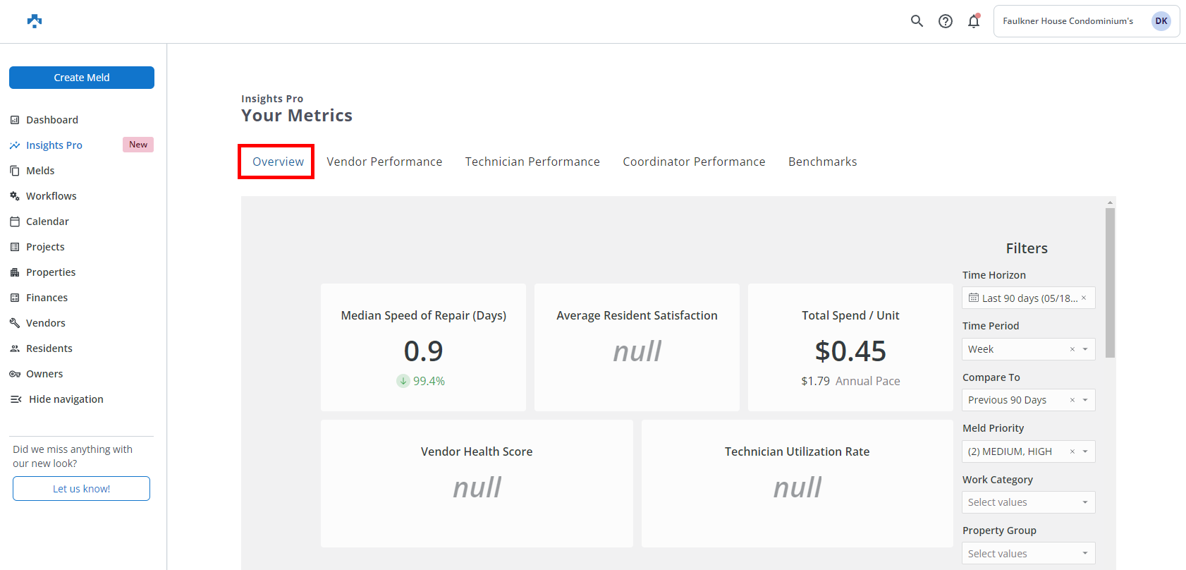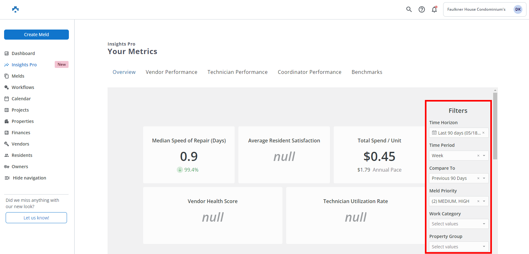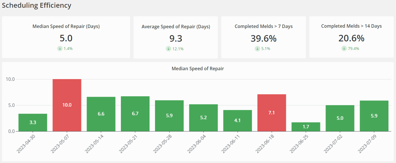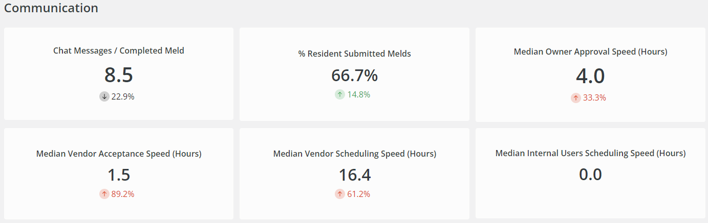 Once your filters are set, you can then gain a better understanding with your maintenance operations as they related to Speed of Repair, Vendor Health Score, Communication, Scheduling Efficiency, Staffing Efficiency, Resident Satisfaction, Maintenance Spend, and more.