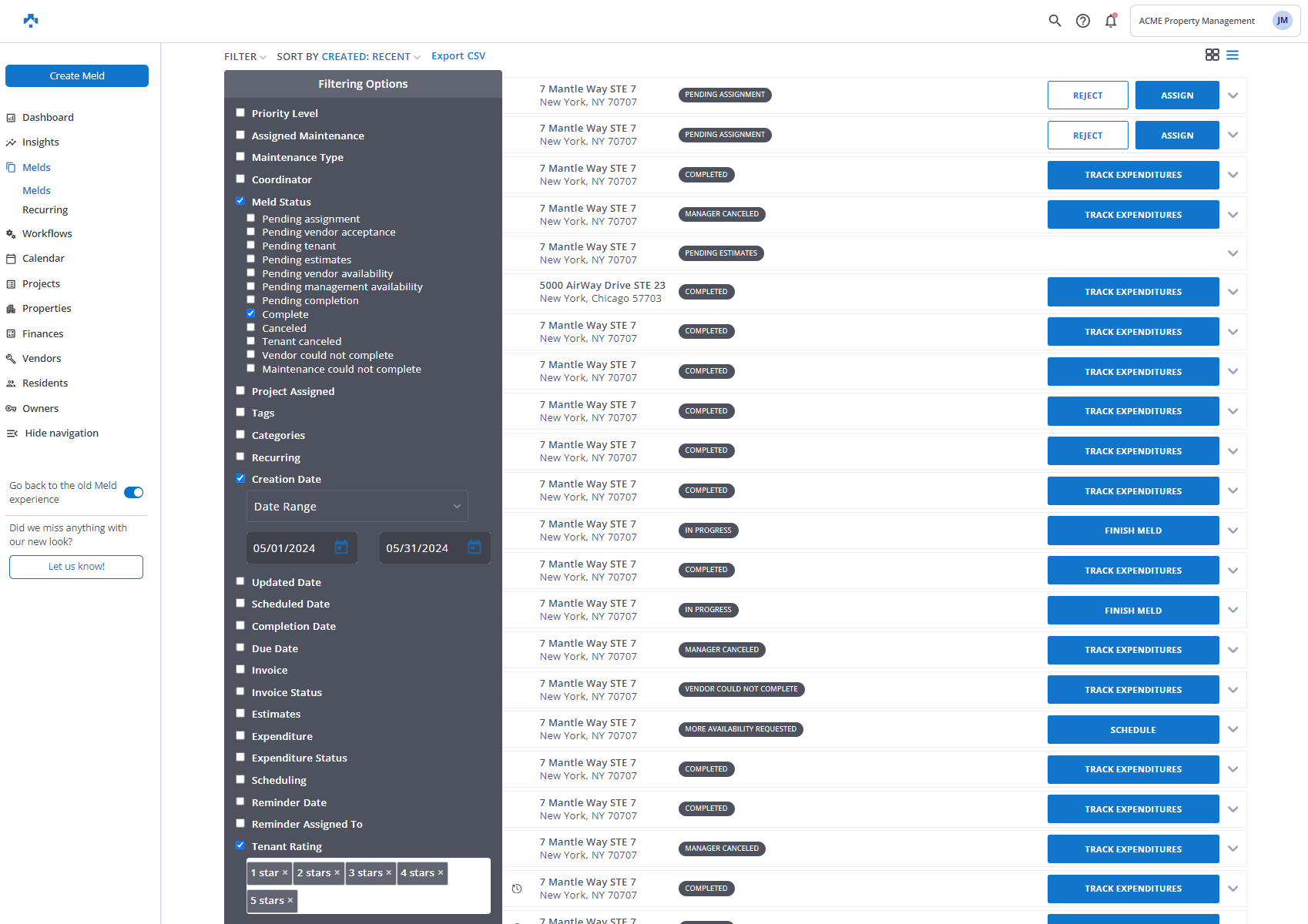 After you select the criteria for your filter, click APPLY FILTERS. For this example, I selected completed melds that were created in the month of October of 2021 to include all resident ratings.