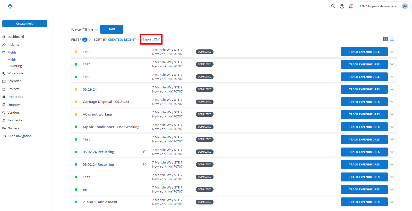 Click Export CSV. This will automatically email a report of all Melds in your filter to the email you are signed in with.