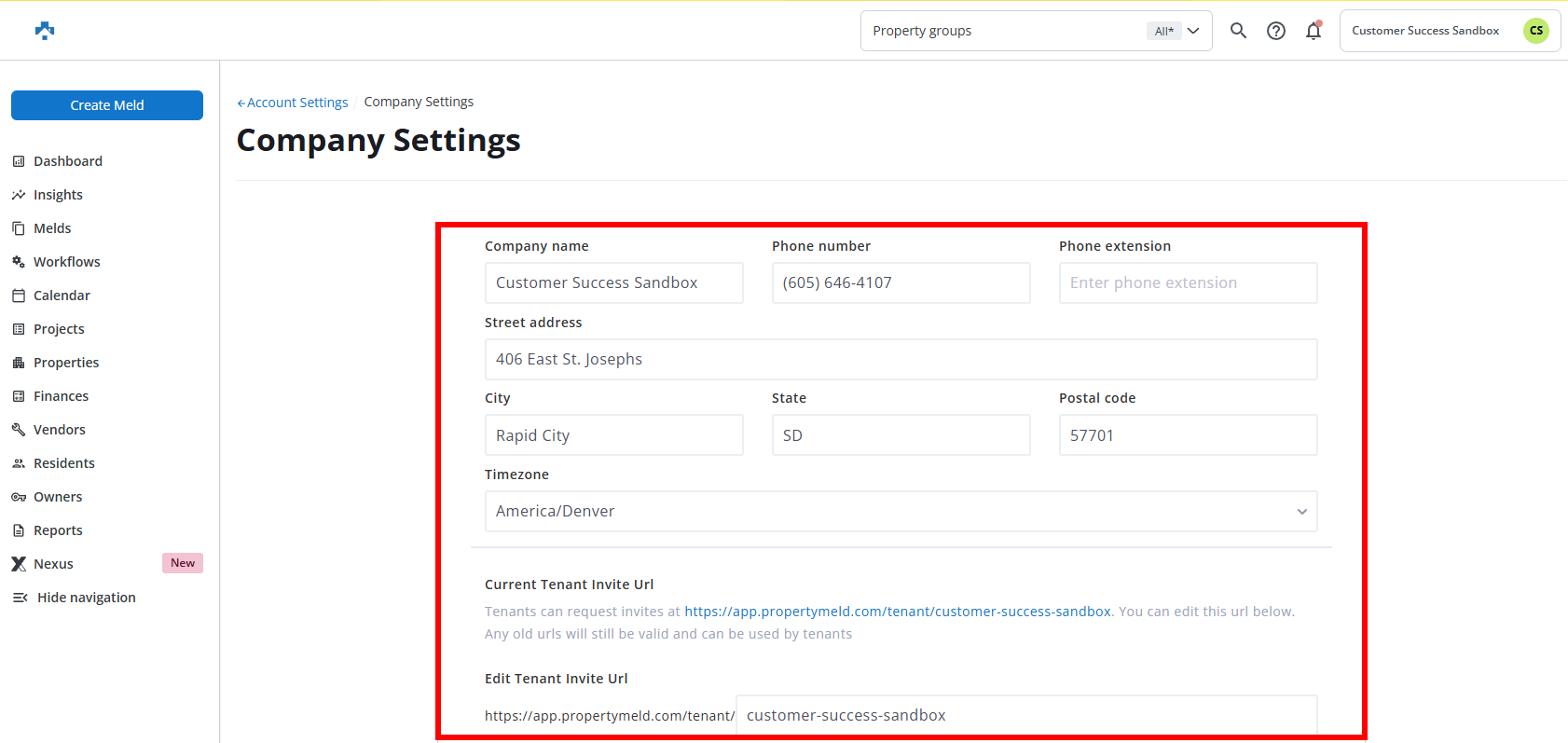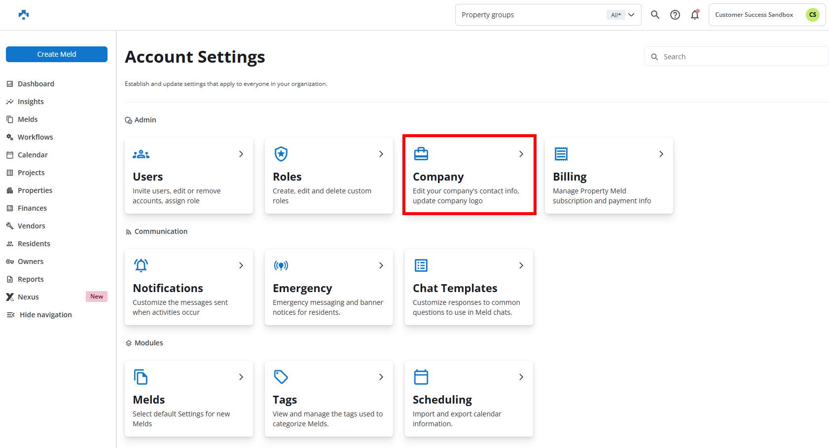 The Company page in Account Settings will allow you to set your company's name, email address, phone number, and physical address.