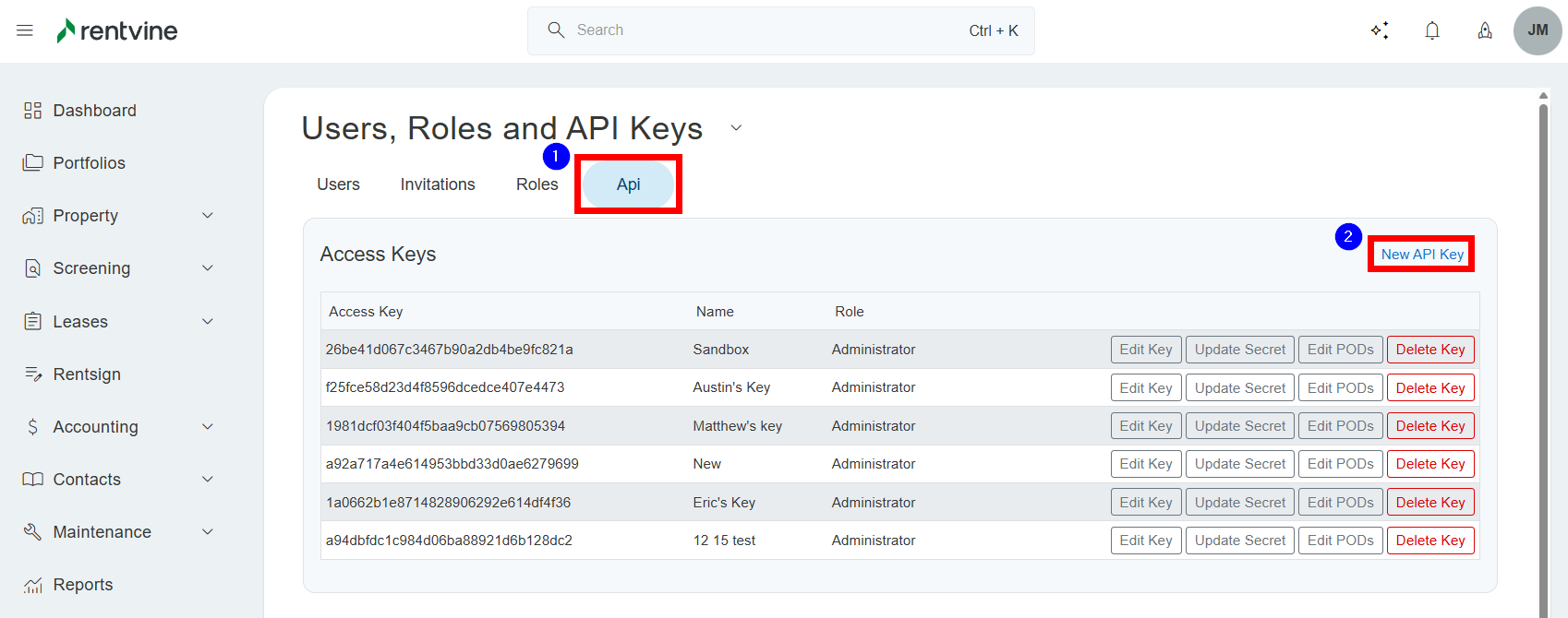 IMPORTANT: When creating the APIs to send to Property Meld, select the highest Administrator role in Rentvine. See Step 3 below for a screenshot of what this looks like in Rentvine.