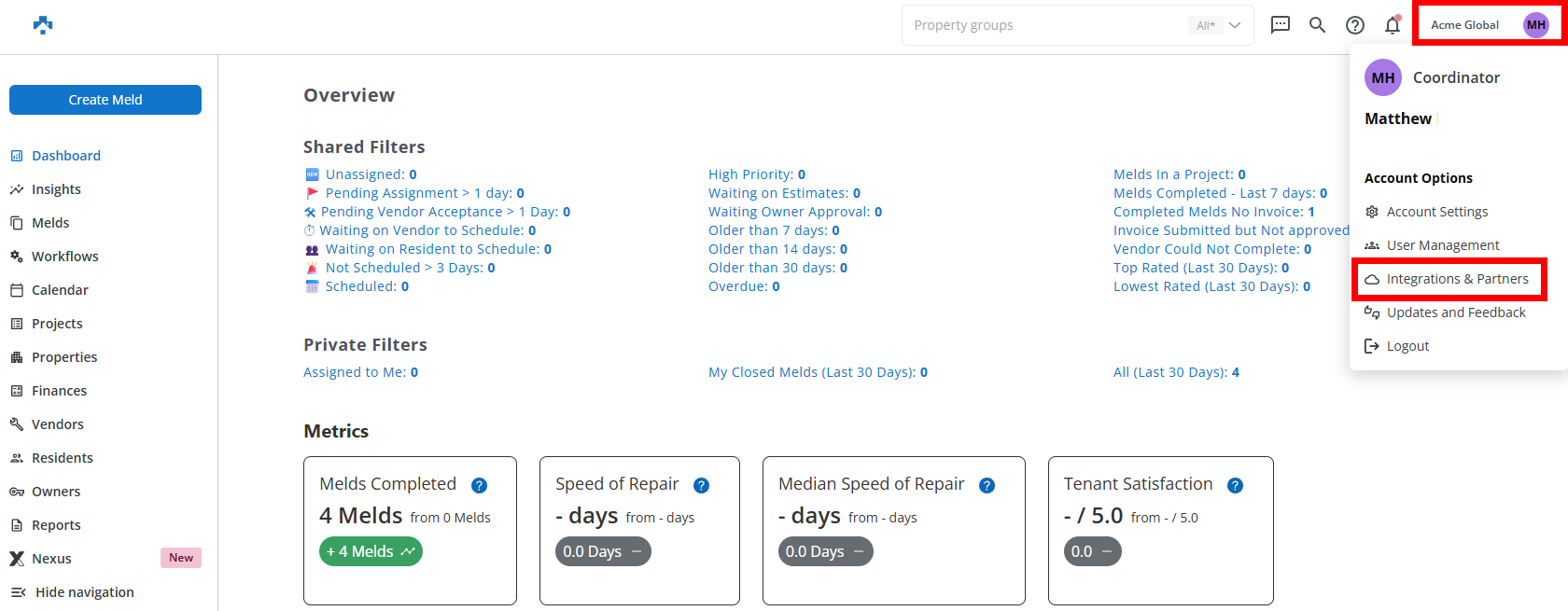 To access Integration Settings, click your Company Name and select Integrations & Partners.
