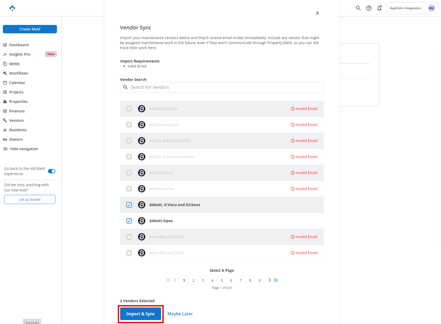 NOTE: Only vendors that are not already successfully Linked or Imported into Property Meld will appear here.