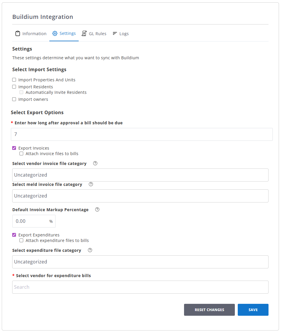 The Settings tab determines what information will sync between Property Meld and Buildium. Below are descriptions of each setting.
