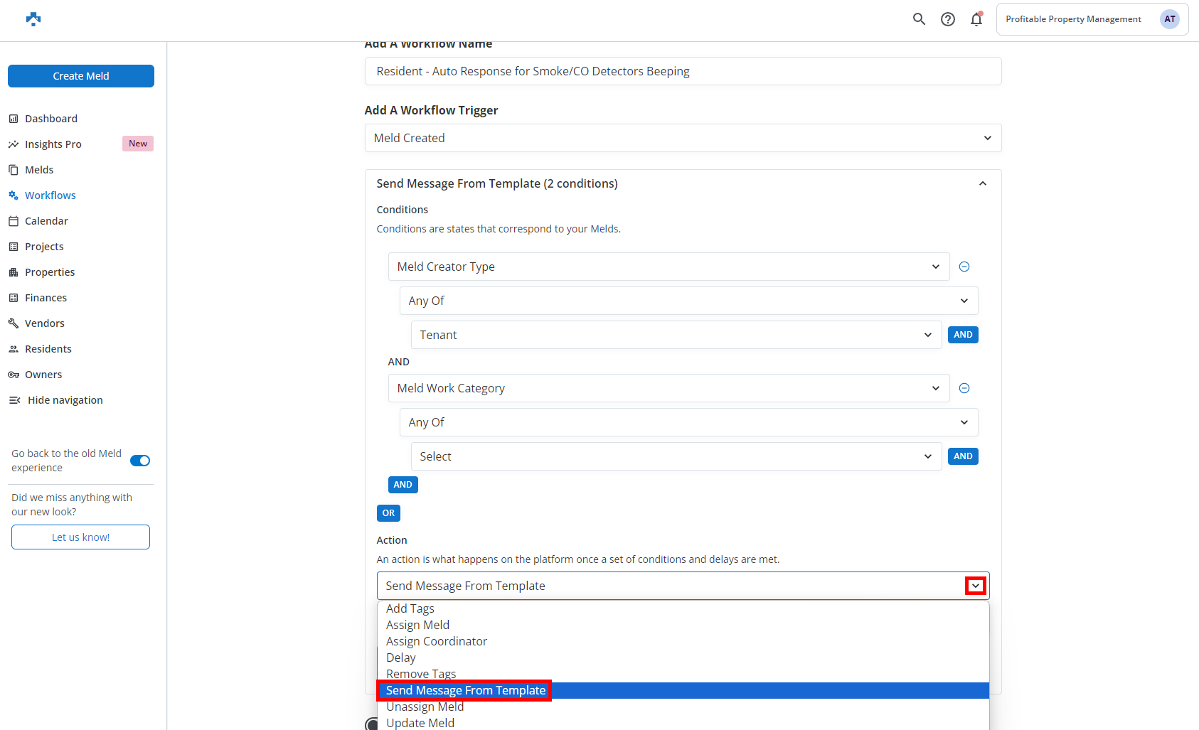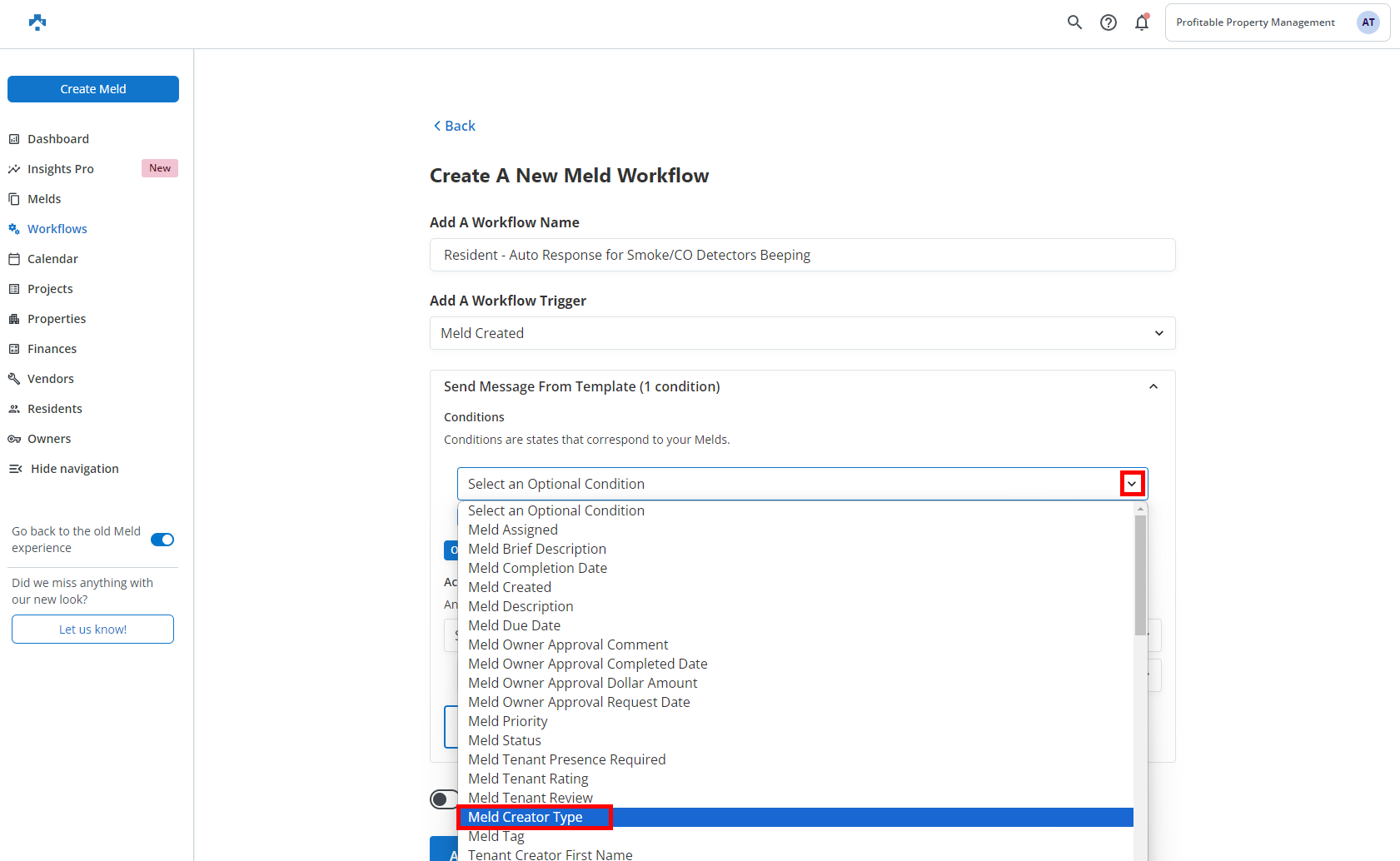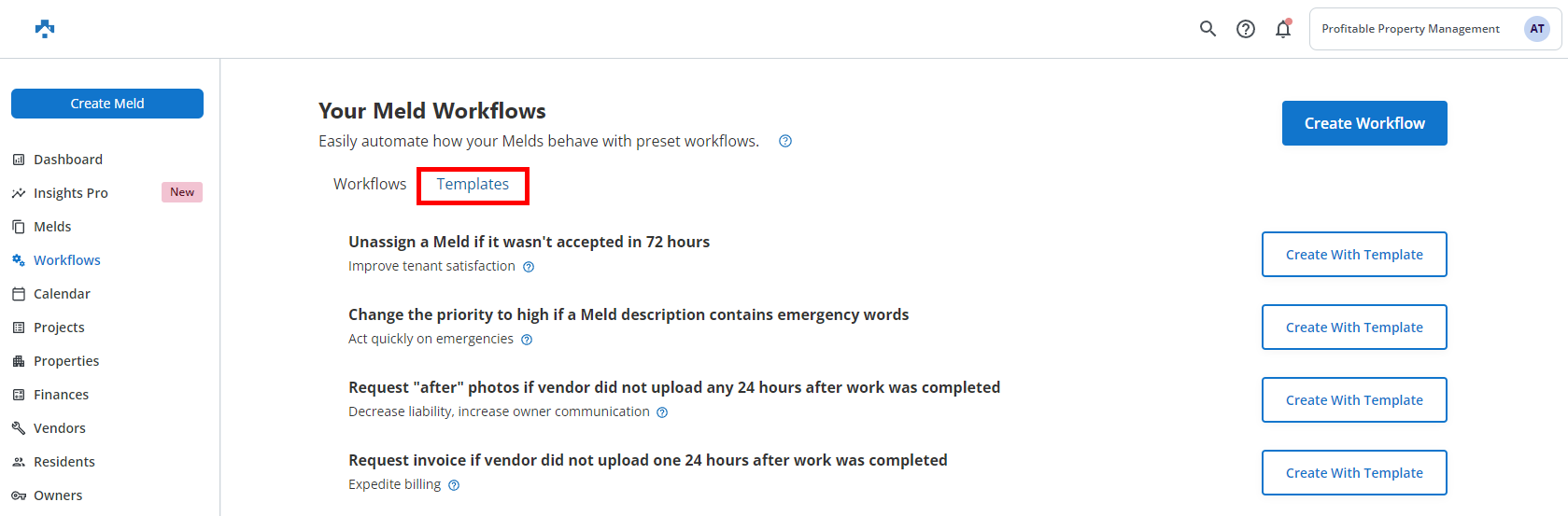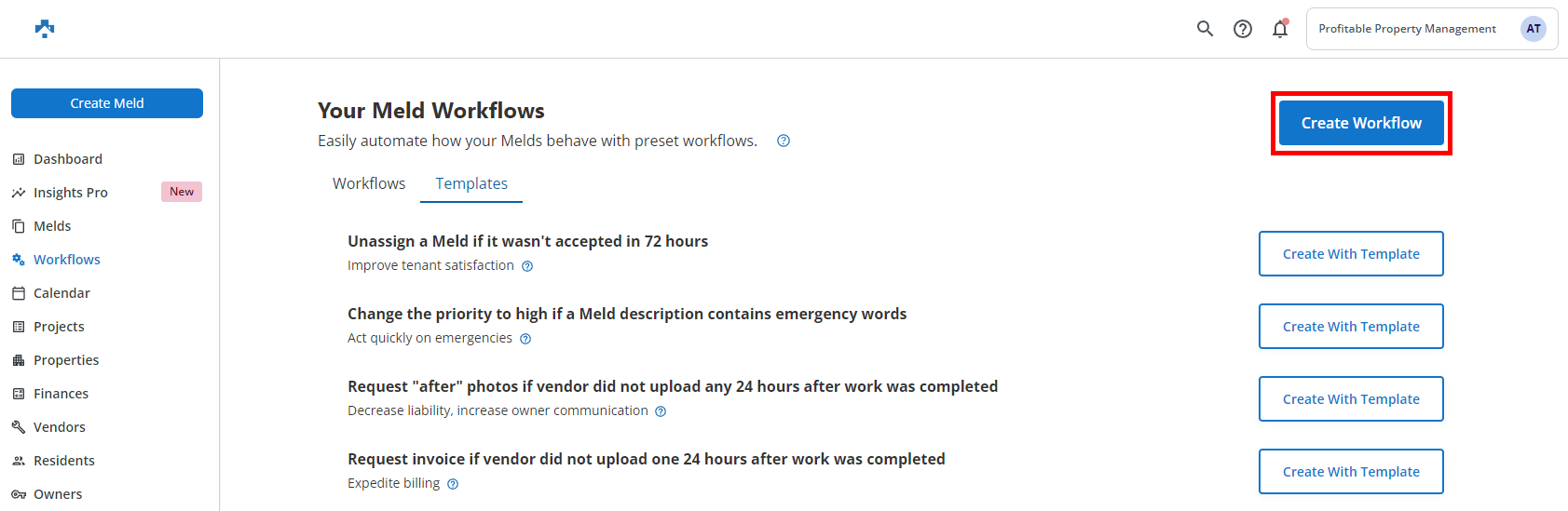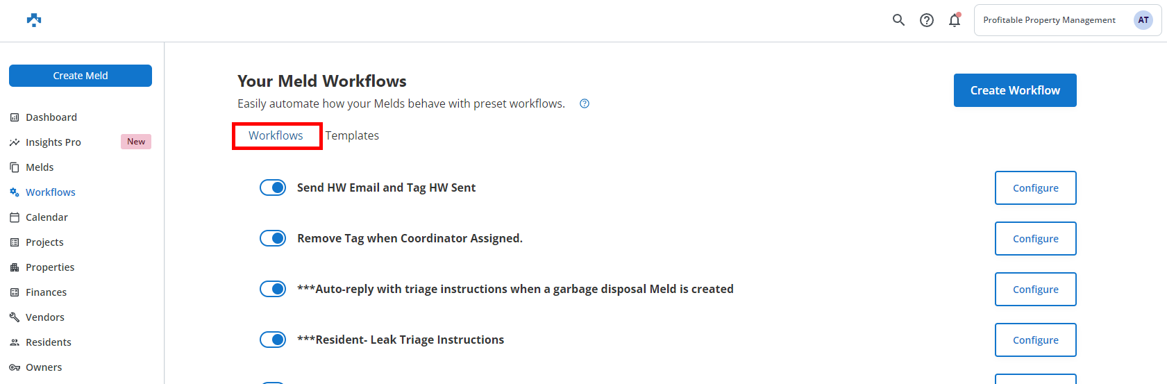 Meld Workflows are a way for property managers to easily automate how Melds work. Workflows are designed to help your team move faster and automate manual tasks that are required during the Meld process.