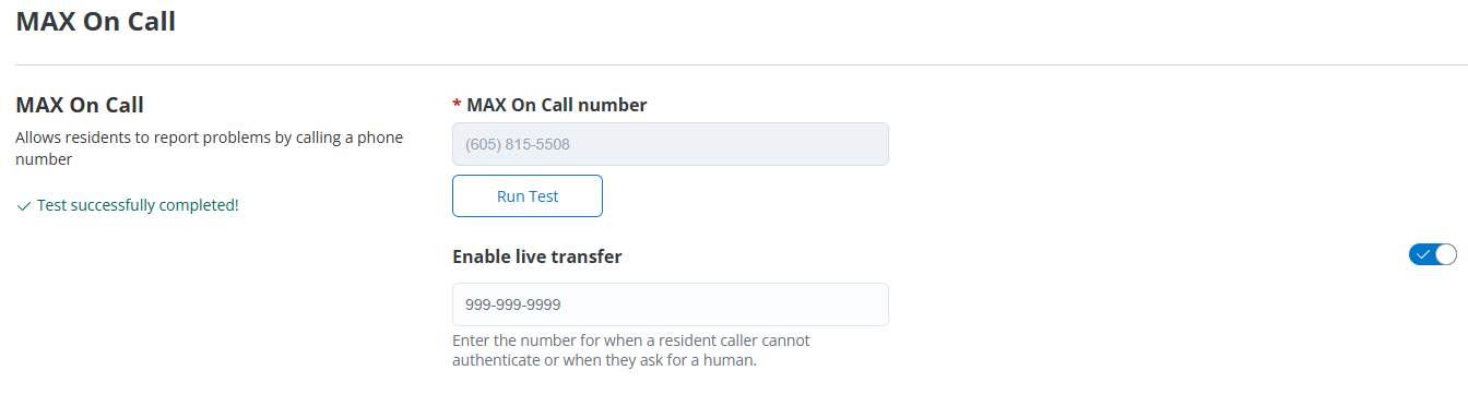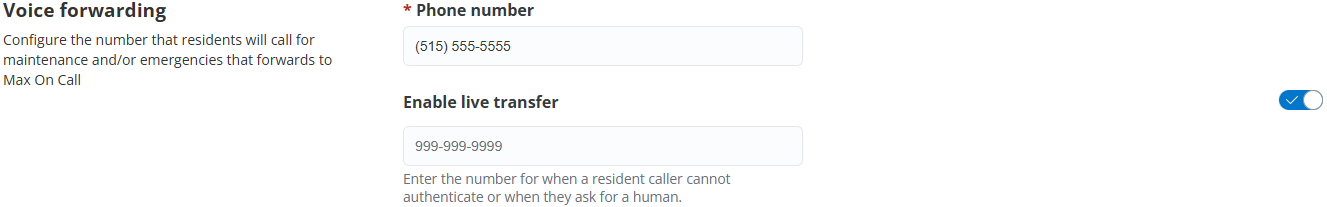 Enable live transfer by assigning a contact phone number. This allows MAX to connect residents directly with a live agent when necessary.