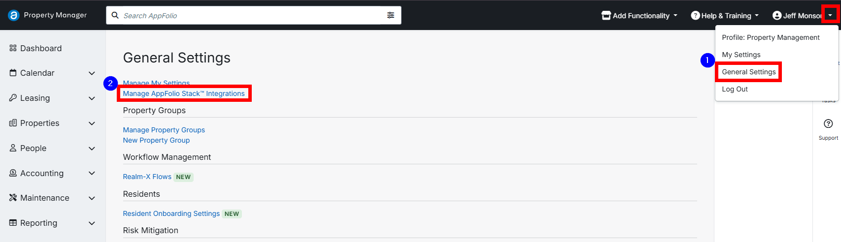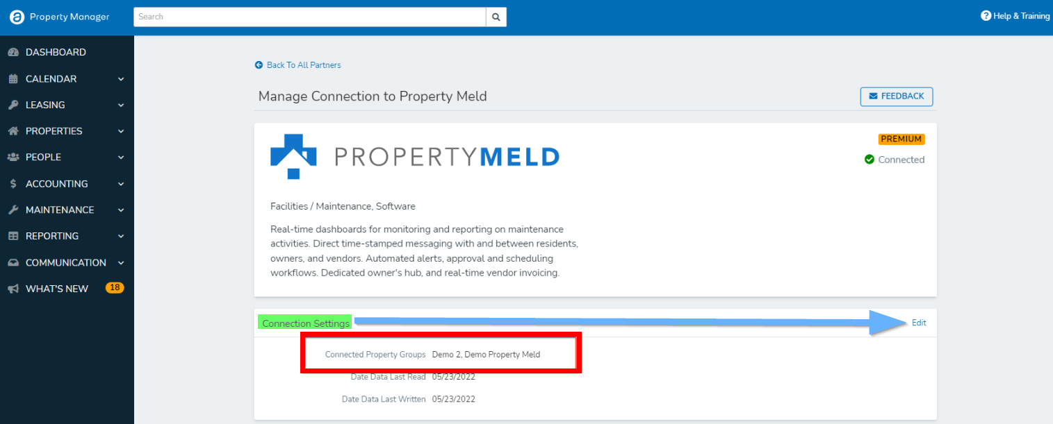 General Settings → Manage AppFolio Stack™ Integrations → Find Property Meld → Connection Settings
