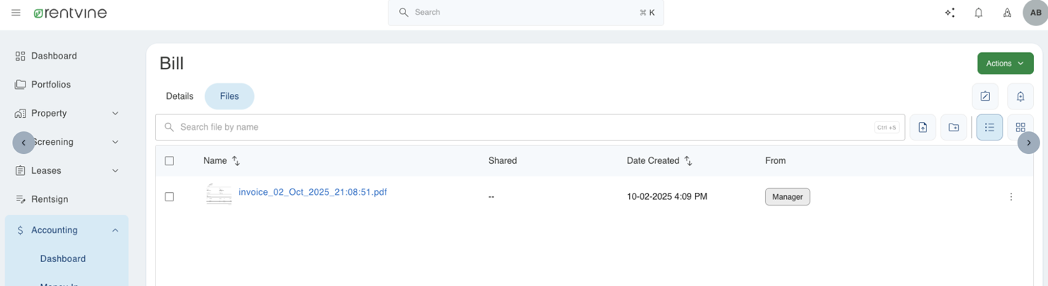 When set to Export as Bills, Property Meld creates a Bill in Rentvine for each approved invoice. The bill includes the invoice reference number and itemized charges, and the invoice PDF is attached to the bill.