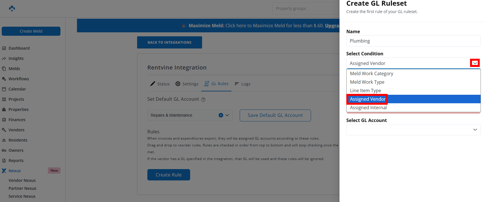 NOTE: Other available conditions are Line Item Type and Meld Work Category. For this article, Assigned Vendor was selected.