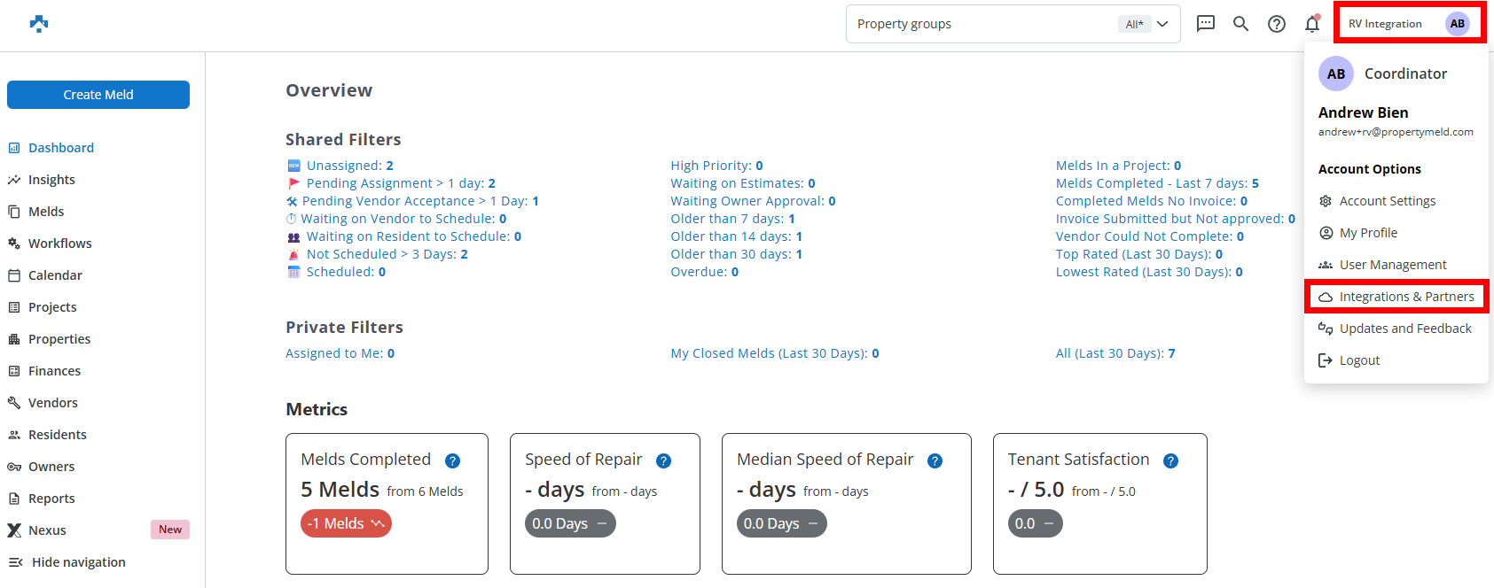 To access Integration Settings, click your Company Name and select Integrations & Partners.