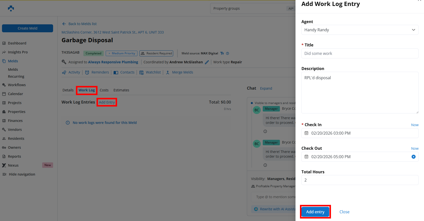 Add labor in Work Logs (for example, log 2 hours).