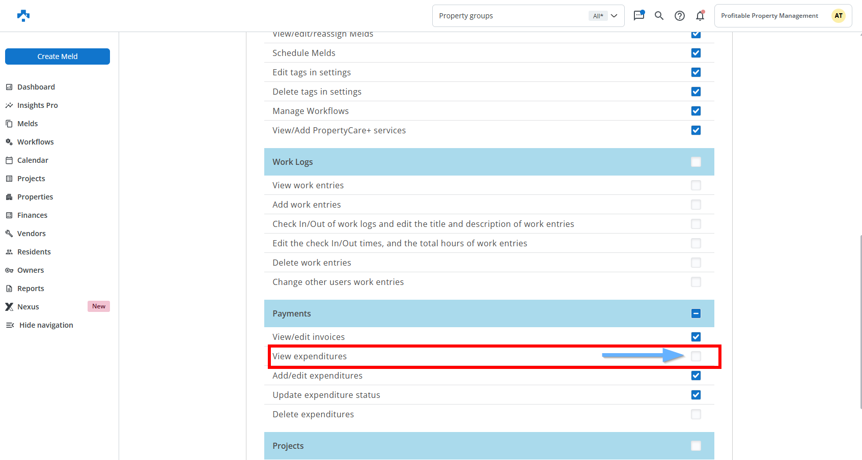 Under Payments, disable View expenditures.